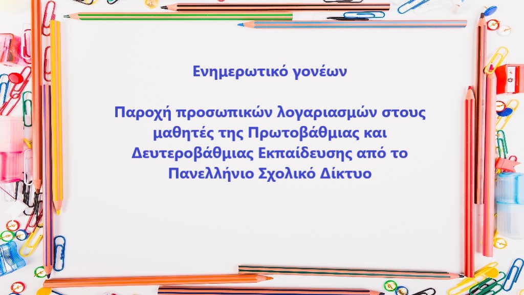 Εσείς, ως γονείς και κηδεμόνες των μαθητών/τριών του Σχολείου μας, θα πρέπει να δημιουργήσετε για τα παιδιά σας ένα λογαριασμό στο Πανελλήνιο Σχολικό Δίκτυο. Για να δείτε τις οδηγίες εγγραφής πατήστε το σύνδεσμό που είναι εδώ
